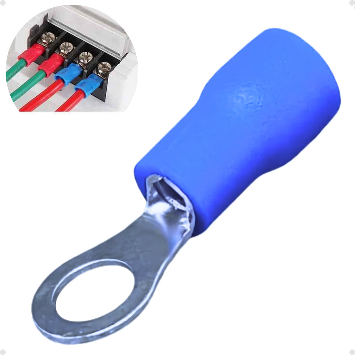 Este é o Terminal Olhal Azul Pré-isolado 1,5mm a 2,5mm M4 - 100 Peças, um produto de alta qualidade da marca TRIAR. Este terminal é feito de cobre eletrolítico, garantindo excelente condutividade e durabilidade. O conector é do tipo anel, especificamente do gênero olhal, proporcionando uma conexão segura e eficiente.